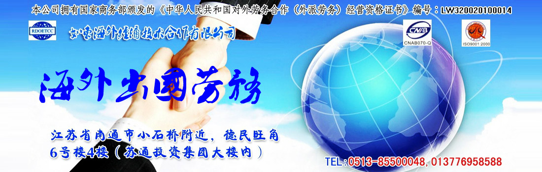 欢迎访问南通海外出国劳务公司网站!★ 本公司拥有国家商务部颁发的《中华人民共和国对外劳务合作(外派劳务)经营资格证书》,编号:LW320020100014